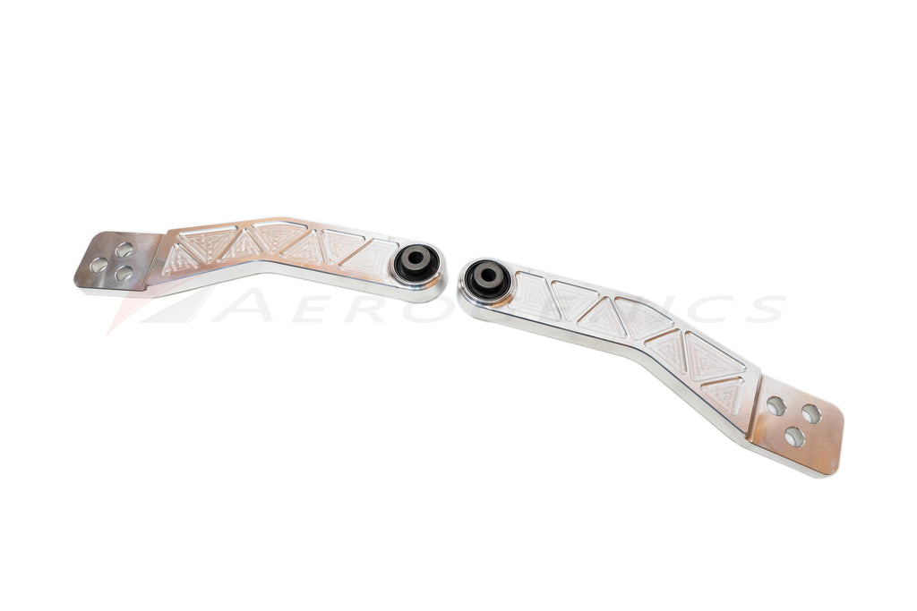 Aerogenics high-clearance lower control arms are designed with over 2 inches of extra clearance underneath the arms. These arms are designed after we offroaded our Element and realize that we can add more clearance in our rear arms! We CNC machined this product in our Los Angeles facility. Entirely made of aerospace grade 6061-T6 aluminum, these arms will not rust or break over the course of its life. We include a custom 10 point socket to remove the OEM arms, zinc plated hardware, two lower control arms, and original Honda bushings (52364-SCV-A02). OEM hardware is reused.