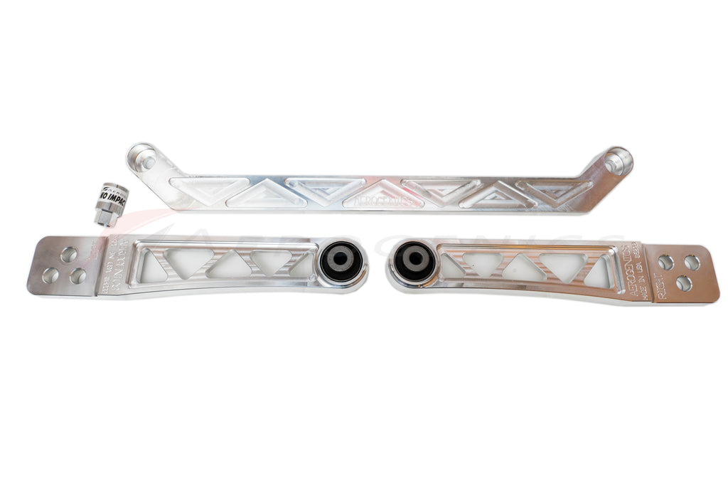 We've now paired the tie bar with our billet lower control arms to complete the aesthetic! The Aerogenics billet rear lower tie bar and lower control arm kit is design to "tie" the vehicle at the two rear suspension points connecting the arms which reduces chassis flex. Now installed with OEM Honda bushings.