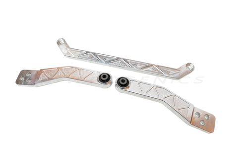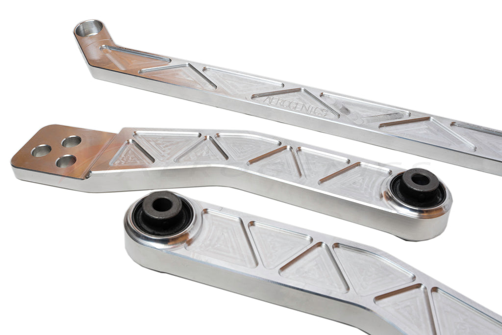 We've now paired the tie bar with our billet lower control arms to complete the aesthetic! The Aerogenics billet rear lower tie bar and lower control arm kit is design to "tie" the vehicle at the two rear suspension points connecting the arms which reduces chassis flex. These Aerogenics rear lower control arms are installed with OEM Honda bushings.